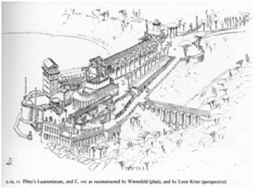 El primer texto es de la época romana. La Epistola 2.178 de Plinio dibuja detalladamente en palabras su villa en Laurentinum para persuadir a un amigo suyo llamado Galo (Clusinius Gallus) a visitarlo. Por siglos los críticos han tratado de reconstruir la casa y su jardín basados en la carta, pero sin llegar a un resultado satisfactorio (ver Fig. 1)9. Esto es porque no es un dibujo arquitectónico sino un tour de force que, en su uso de los topoi del laude locorum y la descriptio regionum, se aproxima a la ficción aunque sigue la estructura de las cartas en cuanto a la ordenación de las circumstantia (dedicatio o salutatio, prohemium, narratio, peroratio o conclusio y subscriptio)10.