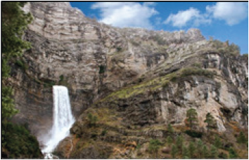 La entrada del es vn rio arriba muy claro y hermoso, el nasçimiento del qual es cosa de muy gran admiraçion, por quanto el sale, quan grande es, por vna boca de vna cueva, la qual sale en comedio de vna peña tajada, la mas alta que yo vi en mi vida, y ay tanto de la cueva a lo alto como della a lo bajo, y de allí salta el rio, y da ayuso en un pielago hecho por natura en peña biva, y alli esta el espesura ansi alta como baja, que apenas se puede ver el çielo ni el sol. En dias de verano alli no entra ni se puede sentir calor alguna, antes es demasiada la frior. El sonido del golpe del agua es tan grande que a muchas trompetas y atabales privaria68.