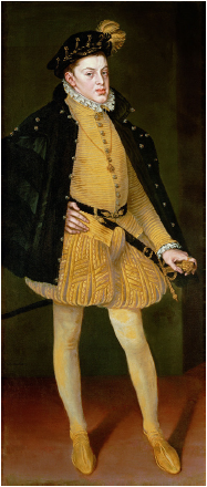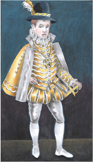 Como consecuencia de estos hechos fue preciso convocar nuevas Cortes para jurar al heredero, fijándose la ceremonia el 15 de octubre de 1584 para el 11 de noviembre siguiente68. Para la solemne ocasión Rodríguez confeccionó al rey un vestido negro compuesto de ropilla de gorgorán, calzas de terciopelo y capote de raja aderezado con cordoncillos sobre pestañas de raso, al que acompañaron una gorra alta de terciopelo y el Toisón «grande» de Oro69. Asimismo, para el príncipe don Felipe cosió un coleto de raso amarillo de Florencia bordado con hilos de plata en labor de «pecho de azor»70, y un bohemio de la misma guarnición forrado con lama de idéntico metal71. Completaban el atuendo el collar del Toisón que le fue impuesto con ceremonias reales en Aranjuez el 1 de mayo de 1583, botas blancas, espada dorada con vaina de terciopelo amarillo, y gorra negra aderezada con un cintillo de perlas, del que nacían péndolas blancas y amarillas que fueron suministradas por el plumajero Pedro de Torres72 (fig. 9).
