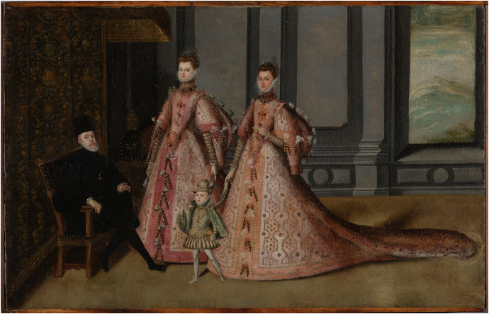 El príncipe iba ataviado por Francisco de Herrera en sintonía con su madre con un baquerillo largo de raso blanco guarnecido con cenefas labradas de canutillo de oro, plata y perlas, y sus mangas colgantes «a la turquesca»44 (fig. 6). Por su parte, Geneli optó por vestir a las infantas Isabel y Catalina con sayas de seda morada guarnecidas con terciopelo y bordaduras de canutillo de oro y plata, además de sendos jubones de raso blanco labrado. Ambas fueron dispensadas de jurar a su hermano por razones de edad, de manera que presenciaron la ceremonia desde una ventana que daba al oratorio45. Concluido el acto, se retiraron los reyes y acompañantes a sus aposentos y, al día siguiente, llevaron al príncipe al monasterio de las Descalzas.