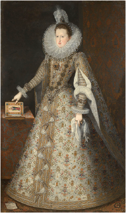 La saya de la soberana fue elaborada con diecinueve varas de lama blanca de plata y hojuela importada de Milán, y otras diez varas de raso blanco de Florencia en las que Juan de Burgos bordó la cenefas ornamentales, las manguillas estrechas y la delantera del jubón83. El cuello, la pechera y los perfiles del sayuelo fueron guarnecidos con exquisitas martas cibelinas por el pellejero Adrián Millor84, añadiéndose a la imagen mayestática de doña Margarita refinadas cadenas de diamantes y una gorra por tocado85.