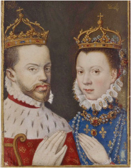 Es particularmente interesante el hecho de que la misma fórmula indumentaria de significado triunfalista utilizada en la jura del príncipe Baltasar Carlos se repitiese en la primavera de 1644, cuando Felipe IV encargó a su bordador Gonzalo Callejón122 un albornoz militar rojo de exuberante labrado de guirnaldas —conforme al color de la divisa textil de los altos rangos del ejército hispano, y por tanto, distintivo nacional123—, con el cual, pasó revista a las tropas durante la campaña de recuperación de Lérida finalmente lograda (fig. 18). Lógicamente, este acto debe ser interpretado como un recurso propagandístico con el que mantener la moral alta del ejército enviado al frente catalán y suscitar la esperanza de victoria, pues así lo corroboraba Pellicer en uno de sus Avisos históricos al declarar que los vítores de las tropas fueron grandes y «desde el rey don Felipe II, su abuelo, no se había visto otro día semejante ni rey español en campaña»124. Por consiguiente, puede afirmarse que el uso del color patrio en el atuendo del monarca tuvo la finalidad de acentuar su condición de máxima autoridad en un periodo de inquietud política que demandaba alimentar el fervor nacionalista. La prueba de que además del consabido negro, también el color carmesí se vinculó a la monarquía española aparece perfectamente reflejada en el retrato en miniatura que Clouet realizó a Felipe II tras contraer matrimonio con Isabel de Valois (fig. 19), y que lejos de ser una efigie fantasiosa en el indumento, tenemos la certeza de que el Rey Prudente utilizó con frecuencia vestiduras escarlata en la primera década de su reinado125. Por ejemplo, en 1563 se compraron al mercader Francisco Briones «dos varas y cinco sesmas de tafetán carmesí entredoble para entretelas a un jubón de raso carmesí pespunt[e]ado para Su Majestad», y en junio de 1564 otras «dos varas y dos tercias de tafetán carmesí para entretelas de otro jubón de raso carmesí […], [además de] tres varas de terciopelo [de] dos pelos carmesí de Granada para unas calzas a Su Majestad». Asimismo, el 4 de mayo de 1566 el cordonero Baltasar del Castillo «hizo catorce varas de pasamanos de labores anchos de seda carmesí para una ropa de damasco carmesí para Su Majestad»126.