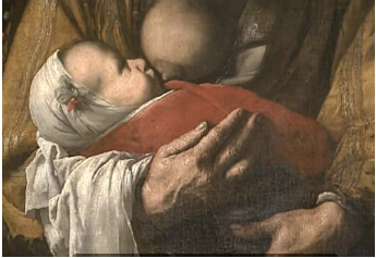 La confluencia del escarlata y la guarnición de ramos de olivo en el baquero de Baltasar Carlos sugiere que también pudo haber una finalidad profiláctica. Es bien conocida la convicción de que el rojo, por ser el color de la sangre, procuraba salud a los infantes, razón por la cual llevaron dijes de coral, bien en ramitas o en sus diversas formas de talla. La atribución mágica a este color ya existió en el periodo medieval, de manera que se cubría a los recién nacidos descendientes de reyes con mantillas carmesí128. Existen testimonios gráficos que avalan la prolongación de esta práctica hasta la Europa del «seiscientos» (fig. 20), y está documentado que los neonatos Habsburgo llevaron tales mantillas129. Asimismo, no hay que olvidar que el ramo de olivo es un atributo pasionario que alude a la entrada en Jerusalén, la oración en el huerto y la resurrección victoriosa de Cristo, de modo que pudo haberse recurrido a la representación de este elemento ornamental con una intención protectora o apotropaica, pues sabemos que la fecha de la jura se retrasó dos semanas por la indisposición del príncipe130, además de que algunos de los trabajos de Negrilla fueron utilizados con esta finalidad, como fueron los escapularios que se vestían sobre los baqueros y habitillos131.