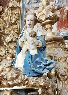 El convento fue desocupado con la desamortización de Mendizábal147, aunque la imagen de la Virgen fue reubicada debajo del relieve de la transfiguración de Cristo que preside el retablo mayor de la iglesia de El Salvador de Rágama (fig. 22). No sabemos a ciencia cierta si esta talla fue la misma que se veneró en el Siglo de Oro, pero lo cierto es que, a pesar de ser de bulto de redondo, se la vistió. De hecho, su patrimonio textil se conservó hasta hace poco más de cuatro décadas, siendo entonces, cuando un sacerdote maniático que regentaba la parroquia de Rágama menospreció su valor, y en un acto falto de juicio, lo quemó; negándonos con ello la oportunidad de conocer si entre esos indumentos se encontraba el manto carmesí donado por Isabel de Borbón. Probablemente, este fue el mismo párroco que, hacia 1980, tomó la nefasta decisión de repintar la imagen con acrílico, desapareciendo para siempre su policromía original148.