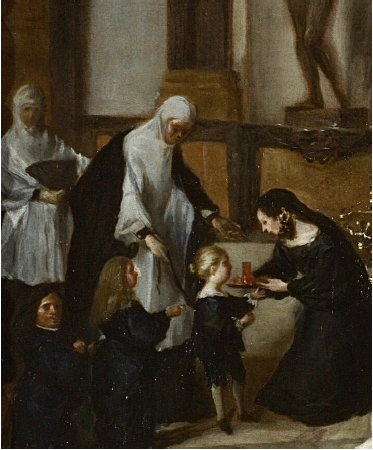 El hecho de que la reina encomendara a Juan de Piña la tarea de llevar la dádiva hasta el convento trinitario de las Virtudes viene a refrendar la estrecha relación que existió entre los monarcas y la Compañía de Jesús, de la que sabemos que se hicieron otras donaciones textiles ex profeso por mediación del citado fraile. Consta que en diciembre de 1632, Negrilla bordó con hilo de oro y perlas sobre raso azul un manto para una imagen de la Compañía, cuyo coste ascendió a doscientos ochenta reales134. Los jesuitas devolvieron estas atenciones en forma de regalos al príncipe Baltasar Carlos en las frecuentes visitas que la familia real realizaba al Colegio Imperial, donde disfrutaban de la representación de comedias tras las que eran invitados a merendar135.