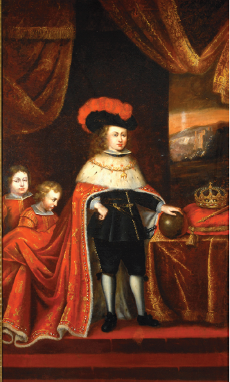 Pero quizá, en lo concerniente a la indumentaria del nuevo soberano, el aspecto más significativo es que, vencido el reglamentario periodo de luto, las vestiduras negras permanecieron en su guardarropa infantil, pues la inestabilidad político-institucional hizo necesaria la utilización del traje nacional con fines propagandísticos. Los registros contables del Archivo de Palacio son muy explícitos. A lo largo del año 1664, cuando el párvulo aún era príncipe, se le confeccionaron 15 vestidos, y todos ellos fueron de colores alegres: 9 blancos, 3 rojos, 2 celestes y 1 verde159. En cambio, durante el año 1667 se le hicieron un total de 17 trajes, y aunque parte de ellos presentaban vistosos textiles importados de la incipiente capital francesa de la moda, 4 siguieron el oscuro canon habsbúrgico160. La artimaña era evidente: había que mostrar al joven monarca con el significante vestido «a la española», rememorando con ello la imagen de sus predecesores que habían sido capaces de dirigir con firmeza el destino de la nación. La condición mayestática del rey niño fue subrayada con los iura regalía que de forma indefectible acompañaron sus efigies: cetro, corona, esfera y un majestuoso manto carmesí con las armas de Castilla y León (figs. 24-25); unos atributos absolutamente extraños en la tradición retratística de la Casa de Austria161 pero efectivos para construir la imagen oficial de un monarca infantil.