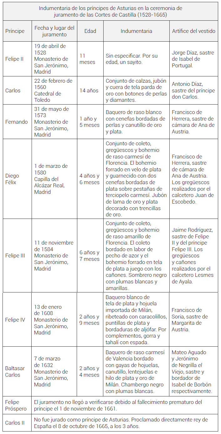 Durante el gobierno de la Casa de Austria el juramento al príncipe de Asturias constituyó un espectáculo político revestido de gran solemnidad, esplendor y fastuosidad, en el que se prestó gran atención al atavío y el adorno de todos los miembros de la familia real. De forma específica sus jóvenes protagonistas fueron vestidos en sintonía con el traje de la reina, optándose por un sofisticado baquero hasta los tres años y el hábito de galán una vez que habían cumplido los cuatro. Esta particularidad indumentaria atendió, además, a un código cromático de significación implícita bien conocido por sus contemporáneos: carmesí y oro mayestáticos (príncipes Carlos, Diego, Felipe III y Baltasar Carlos) y blanco de pureza y regocijo (príncipes Fernando y Felipe IV).
