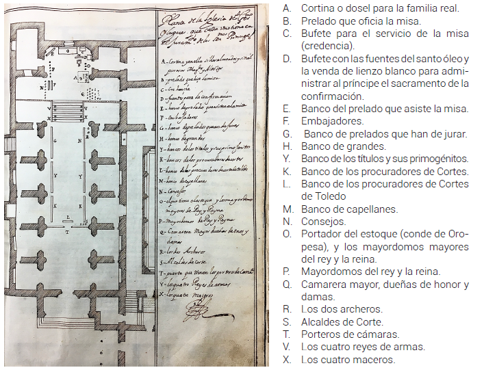 La fijación del ceremonial culminó en 1651 con la elaboración de las Etiquetas Generales de Palacio, en las que se registró por escrito el proceder y la disposición en el templo tanto del acompañamiento como de todos los elementos visuales y litúrgicos que conformaban la escenificación. Este códice, conservado en el Archivo General de Palacio4, incluye una lustración glosada de la planta de San Jerónimo (fig. 1), donde podemos observar la organización establecida en el siglo anterior y aplicada en el juramento del príncipe Baltasar Carlos, último de su estirpe en línea varonil cuya dignidad fue verificada por las Cortes de Castilla.