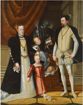 Es interesante señalar que durante la década de 1520 Margarita de Parma, hija natural del emperador, estaba siendo criada en Bruselas por Andrieu de Douvrin, copero de Fernando I, bajo la supervisión de su tía abuela Margarita de Austria, gobernadora de los Países Bajos. Consta que en 1527 la Tesorería General de Borgoña asignó a la niña 449 libras «por mandato y orden del señor emperador» para los gastos de boca de esta y su nodriza, además de «una partida de tela de oro auténtico, sábanas de seda y lino, pieles pardas, martas, cabritillas y otras partidas para hacer ropa para su cuerpo y uso»21. Este hecho pone de manifiesto el trato desigual que existió entre la progenie de Isabel de Portugal, sujeta a ciertas limitaciones en el vestir, y las concesiones otorgadas a la pequeña Margarita; que más allá de constituir un beneficio compensatorio por su situación desfavorable, debe ser entendido como un paradigma de la opulencia de tradición borgoñona.