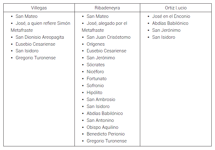 A pesar de dichas diferencias, las similitudes entre los tres autores son llamativas, como es el ya antes mencionado caso del nombre de Polemón o la localización del enfrentamiento entre Bartolomé y Astaroth en Armenia, punto sobre el que volveré más adelante. Además, los tres textos coinciden por momentos de manera casi literal en el relato de la vida de san Bartolomé. Al respecto, es posible que se hayan tomado como fuente entre ellos. Si se toma en consideración las fechas de publicación de las primeras ediciones de dichos textos, el texto hagiográfico de Villegas (1578) pudo haber servido de modelo a Ribadeneyra (1599) y Ortiz Lucio (1605). Sin embargo, resultaría llamativo que Ribadeneyra hubiera tomado el texto de Villegas y haya incorporado más del doble de referencias directas a otros textos (tabla 2).