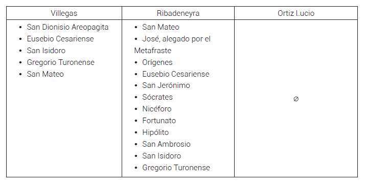También resulta interesante analizar el manejo de fuentes en los tres textos (Villegas, Ribadeneyra y Ortiz Lucio). A continuación, se presentan los nombres de los autores que aparecen en cada uno de ellos: