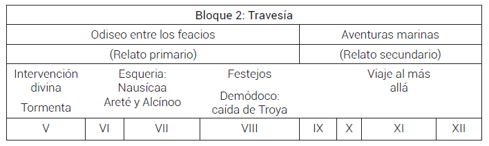 Los estudios relativos a la estructura de la Odisea suelen coincidir en establecer una división tripartita11: los sucesos protagonizados por Telémaco o Telemaquia (cantos I-IV), la larga travesía de regreso de Odiseo (V-XII) y los eventos acaecidos al héroe en Ítaca, donde se enfrenta con los pretendientes (XIII-XXIV)12. El primer bloque narrativo se centra en la figura de Telémaco, el joven hijo de Odiseo, quien sufre el abuso de los pretendientes de su madre. Aconsejado por la diosa Atenea, Telémaco abandona Ítaca y marcha en busca de noticias de su padre. En el segundo bloque narrativo, protagonizado por Odiseo, se relatan las fantásticas aventuras que vivió durante su prolongado vagar marino de regreso a Ítaca. La acción comienza in medias res. Atrapado tiempo ha en la isla de Calipso, la ninfa es apremiada por Hermes para que libere al itacense, según ha decretado Zeus durante una asamblea divina. Odiseo construye una balsa, que se hunde bajo la tormenta enviada por Posidón y naufraga en Esqueria. Allí es acogido afectuosamente por la princesa Nausícaa y agasajado por los monarcas Areté y Alcínoo, quien incluso le ofrece a la princesa en matrimonio. Finalizadas las competiciones atléticas y los festejos en honor al héroe, el aedo Demódoco canta durante un banquete la estratagema del caballo y la caída de Troya. El canto provoca el llanto del héroe. Posteriormente, el propio Odiseo refiere a los comensales las maravillosas aventuras que había vivido por mar tras partir de Troya y hasta llegar a la tierra de los feacios en un amplio relato secundario que se extiende a lo largo de varios cantos (IX-XII). Dentro de este relato secundario, el héroe revela ante la maravillada audiencia de los feacios el viaje que realizó a la entrada del inframundo, donde evocó a las ánimas de los difuntos.