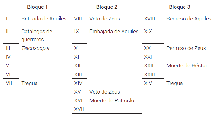 La estructura de la Iliada resulta más difícil de acotar. Si bien hay cierto consenso acerca de la naturaleza tripartita de la obra, existen importantes divergencias en la asignación de los cantos que conforman cada una de las partes14. En cualquier caso, resulta patente la función estructural de la intervención del Pelida Aquiles y su influencia en el devenir de la contienda. La primera parte (I-VII) se abre con la disputa del héroe con Agamenón por la esclava Briseida y su retirada del combate. Se presenta a los ejércitos beligerantes a través de enumeraciones, como el famoso catálogo de las naves aqueas o el consecutivo listado de las tropas del bando troyano, que se complementan con el episodio de la teicoscopia: desde la muralla Helena contesta a las preguntas del rey Príamo acerca de la identidad de los caudillos enemigos que divisan en la lejanía. Preparados ambos ejércitos para el combate, se pacta la realización de un duelo entre Paris y Menelao, los contendientes por Helena15; escapado Paris de la muerte por intervención de Afrodita, estalla la batalla, en la que destaca la principalía bélica de Diomedes16. La lucha quedará interrumpida en el canto VII con motivo de otro duelo, ahora entre Héctor y Áyax: tras atacarse con las lanzas, Héctor golpea el escudo de Áyax con una gran piedra. Este lanza una roca mayor, que dobla el escudo del troyano, golpea sus rodillas y le hace caer al suelo. Se disponen a luchar con la espada, pero unos heraldos anuncian la llegada de la noche y el fin del combate. Finalmente, los dos bandos acuerdan una tregua con el fin de tributar honras fúnebres a los soldados caídos. La segunda parte (VIII-XVII) muestra las consecuencias de la ausencia de Aquiles en el combate. Zeus prohíbe participar al resto de los dioses e impulsa a los troyanos, que consiguen avanzar hasta las proximidades del campamento aqueo. Ante tan crítica situación, se envía una embajada para convencer a Aquiles de que vuelva a la lid, pero este no depone su ira. En los siguientes cantos se relata la encarnizada lucha, incluidas diversas aristeias de destacados guerreros de ambos bandos. Juno seduce y adormece a su marido para que Posidón pueda saltarse el veto divino y favorecer a los aqueos. Zeus descubre el engaño, hace valer su prohibición con la expulsión de su hermano del combate y potencia las fuerzas de los troyanos para que lleguen junto a las naves aqueas. Dado el extremo peligro, Aquiles permite a Patroclo combatir con sus armas, lo que da lugar a la principalía del héroe que, no obstante, termina sucumbiendo bajo la lanza de Héctor: Patroclo muere y se traba encarnizado combate por su cadáver y las armas de Aquiles. La parte final (XVIIIXXIV) se origina por la decisión del Pelida de retomar la pugna para vengar a su compañero. Tras su reconciliación con Agamenón y levantado el veto de Zeus, que ahora permite a los dioses luchar, estalla una batalla marcada por la excelencia bélica de Aquiles, que causa gran estrago en las líneas enemigas, a quienes fuerza a refugiarse tras las murallas de Troya. Atrapado ante Aquiles, Héctor se enfrenta a él y es herido de muerte. Suplica al Pelida que acepte el rescate y permita las exequias de su cadáver. Este se niega y ultraja el cuerpo sin vida del troyano. Tras celebrar unos juegos fúnebres en honor de Patroclo, el último canto contiene la entrega a Príamo del cadáver de su hijo, previo pago del rescate, y el acuerdo de una tregua para realizar el funeral de Héctor.