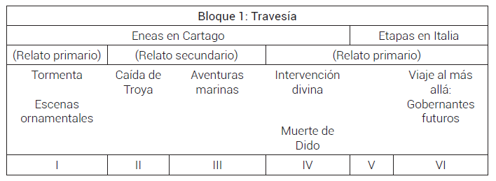 La Eneida aúna elementos estructurales y episódicos de ambos poemas homéricos. Se divide a grandes rasgos en dos bloques narrativos, las aventuras marinas de Eneas durante su navegación (libros I-VI) y los sucesos en el Lacio, en particular el enfrentamiento bélico entre troyanos y rútulos (libros VII-XII)17. La primera parte suele denominarse la «Odisea virgiliana», puesto que se considera paralela al segundo bloque narrativo de la epopeya homérica. A imitación de la Odisea, el relato comienza en un punto intermedio de la travesía del héroe, el cual sufre un naufragio a causa de la animadversión divina: Juno pide a Eolo que genere una tormenta de la que Eneas y su tripulación escapan a duras penas. Arribados a Libia, se dirigen a la ciudad de Cartago, donde Eneas tiene ocasión de observar escenas pictóricas de la guerra de Troya en el templo de Juno. Es recibido posteriormente por la reina Dido, que lo honra con un banquete en cuyo transcurso el caudillo troyano relata la caída de Troya, su huida de la ciudad en llamas y las fantásticas peripecias que ha enfrentado durante la travesía a la nueva patria destinada por los dioses. La monarca fenicia y Eneas entablan una relación amorosa, pero el héroe, instado por la divinidad a seguir el viaje, abandona la ciudad y a la reina. El dolor que sufre Dido por el ultraje de su amado la lleva al suicidio. En consonancia con la Odisea, en la parte central de la epopeya (libro VI de doce) se desarrolla un viaje al inframundo: Eneas desciende al más allá, deambula entre los fantasmas del pasado y conoce de la mano de su difunto padre las almas de sus futuros y gloriosos descendientes romanos.
