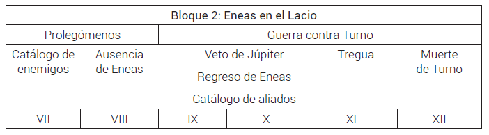 La catábasis virgiliana actúa de cierre de la primera parte y antecede al segundo bloque narrativo, que por su contenido bélico y sus paralelismos con la otra epopeya homérica se conoce convencionalmente como la «Iliada virgiliana». Se relata aquí la llegada de Eneas al Lacio, el ofrecimiento de la mano de la princesa Lavinia por parte de su padre, el rey Latino, y los ardides de Juno para provocar un enfrentamiento armado. La inminencia de la guerra contra Turno, rey de los rútulos y rival de Eneas por Lavinia, aconseja a Eneas ausentarse del campamento para buscar alianzas. Antes se han presentado en forma catalogada los enemigos a los que habrá de enfrentarse el contingente troyano. Tras estos libros introductorios, estalla la guerra propiamente dicha18. Al igual que la retirada de Aquiles en la Iliada, la ausencia de Eneas tiene también funestas consecuencias en la guerra. Aprovechando la partida del caudillo troyano, Juno urge a Turno a atacar el campamento enemigo. El general rútulo actúa y consigue una ventaja provisional. Durante la celebración de una asamblea divina Júpiter ha vetado al resto de dioses la participación en la guerra, por lo que el destino de ambos bandos está en sus propias manos. Por fortuna para el bando troyano, Eneas consigue llegar con tropas aliadas, presentadas en forma catalogada a la manera homérica, lo que invierte la situación. El enemigo es rechazado, pero con importantes pérdidas, como la muerte de Palante a manos de Turno. Esto llena de pena e ira a Eneas y sellará el funesto destino de su enemigo rútulo. Finalmente, y tras una tregua para enterrar a los caídos en el combate, se traba la batalla definitiva junto a las murallas latinas. Aunque Juturna había precipitado a los rútulos al ataque para prevenir la realización del duelo pactado entre su hermano Turno y Eneas, finalmente ambos caudillos entablan combate singular cuando se encuentran en el campo de batalla19. Las tropas se retiran. Ellos se arrojan las lanzas, se acometen con la espada e incluso Turno tira un pedrejón contra el troyano (como hiciera Héctor en la Iliada), pero yerra el tiro20. Herido de muerte, el rútulo pide que se le conserve la vida o al menos se entregue el cadáver a su padre. Muerto Turno, Eneas consolida su posición como pretendiente de Lavinia y futuro rey del Lacio.