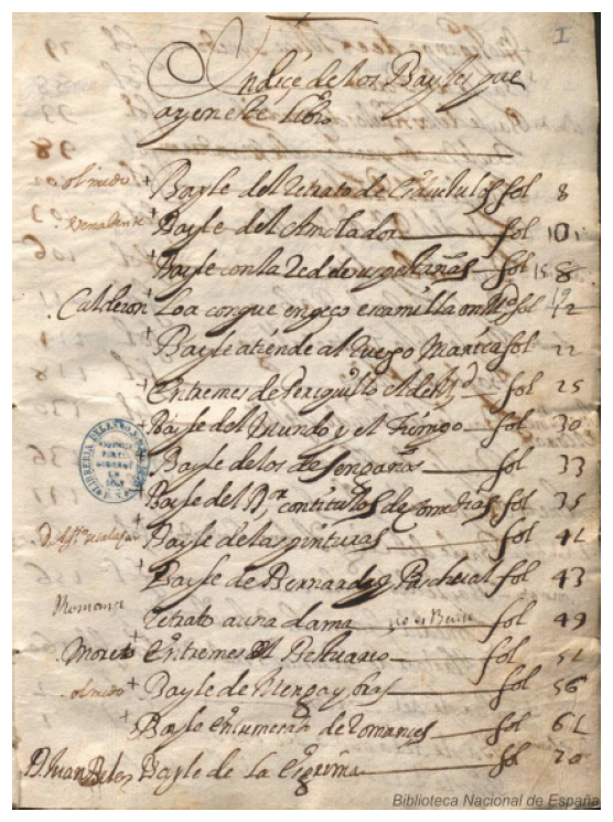 Nuestra loa aparece en el ms. 14.856 de la BNE1, que acoge en su seno hasta casi cincuenta «Bailes diferentes», catalogados debidamente en un índice que señala —en alguno de los casos— el autor al que se atribuye la obra. Veamos una muestra del índice tomada del códice: