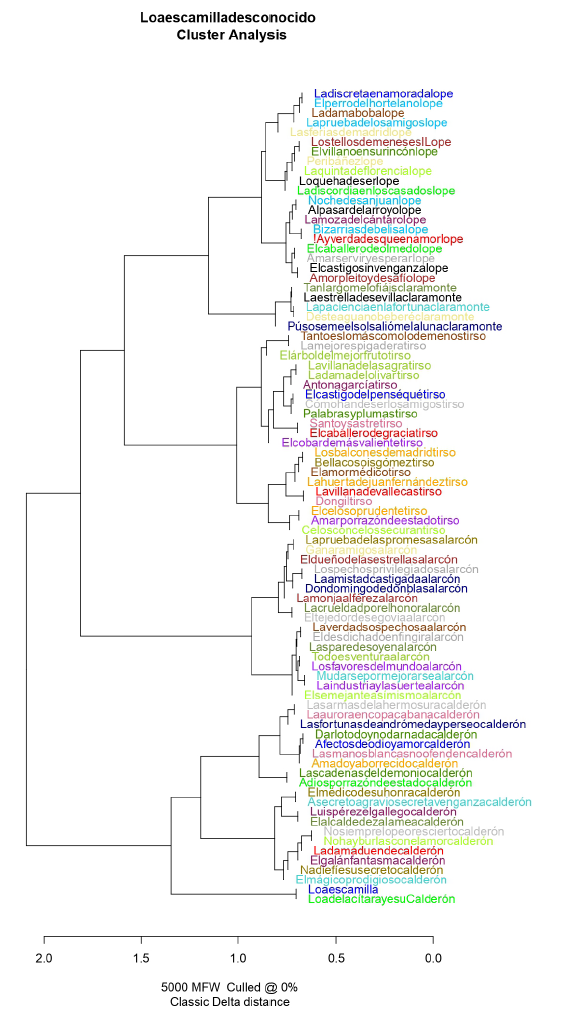 En último lugar, creemos necesario reparar en los elementos internos del texto. Gracias a las herramientas facilitadas por la estadística computacional (estilometría), podemos cotejar el usus scribendi de diferentes obras literarias a partir de la distancia Delta propuesta por Burrows (2002), según la cual se puede discriminar la autoría a partir de la frecuencia léxica de los escritores (repetición de un número x de palabras). Con la función Stylo10 ( ) —imbricada en el software R— se puede llevar a la práctica fácilmente esta idea, y para ello necesitamos cosechar un corpus que incluya los textos en TXT y UTF-8. Nuestro corpus está formado por un centenar de piezas indubitadas del teatro áureo de Calderón, Lope, Tirso, Claramonte y Alarcón, que confrontaremos con el texto de la loa, etiquetado como «Loaescamilla» (sin introducir el nombre del autor). De igual manera, en el corpus hemos incluido una loa sacramental (Loa de la Cithara Iesu Eucharistia) que recientemente se ha atribuido a Calderón de la Barca11. Los resultados del gráfico son esclarecedores: