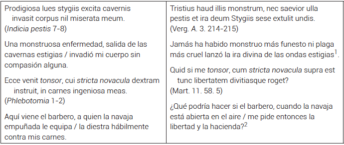 A diferencia de otros textos neolatinos, en De peste variolarumno percibimos un procedimiento centonario en un sentido estricto15, y los elementos originales superan considerablemente a aquellos de segunda mano. En lo que respecta a los préstamos provenientes de otras fuentes, por lo general se trata de dos o tres palabras, a inicio o final de verso. Algunos de estos segmentos incorporan el sentido del original, mientras que otros solo parecen ser el resultado de una memoria poético-musical en lo que, siguiendo a Pigman, podríamos definir como un proceso de reminiscencias inconscientes16. Así, por ejemplo, mientras que en Indicia pestis 7-8 el vínculo con el tercer libro de la Eneida (214-215) involucra principalmente el sentido —el carácter feroz y el origen infernal de la peste, aunque con un stygiis que permite establecer un nexo formal con el modelo—, en Phlebotomia 1-2, la referencia al barbero y su navaja reproduce varias palabras, en el mismo orden y posición, de un verso de Marcial (11. 58. 5), obviando —quizás como resultado de una tradición indirecta— el carácter explícitamente erótico del epigrama: