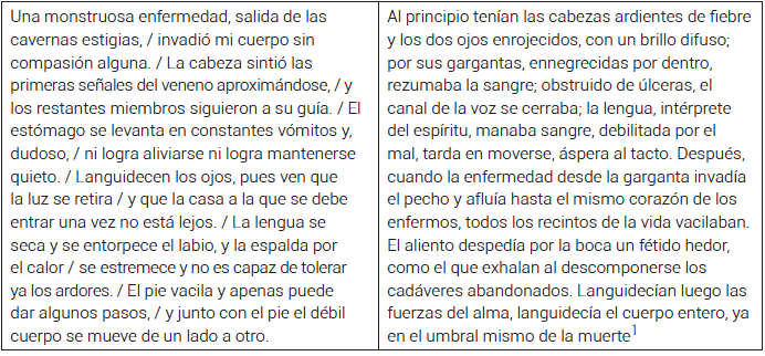 Tomando esto en consideración, resulta casi obligado establecer un vínculo entre De peste variolarum y la descripción de la peste de Atenas en De rerum natura (6. 1138-1286). Si bien no encontramos sino un par de préstamos textuales del autor latino —tampoco se trata, por cierto, de un nexo en lo que respecta a las ideas filosóficas—, una comparación de fragmentos del poema didáctico con el texto de Molina revela su cercanía. Ambas obras son el resultado de una detenida observación y presentan descripciones detalladas, con imágenes concretas y de carácter ecfrástico que recurren principalmente a la vista, pero también se valen de otros sentidos, como el tacto o la audición.
