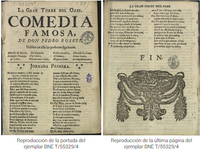 LA GRAN TORRE DEL ORBE. / COMEDIA / FAMOSA, / DE DON PEDRO ROSETE: / Hablan en ella las perſonas ſiguientes. / [ dram. pers. a 4 col.] / [filete formado por 15 secciones] / [tres asteriscos de ocho puntas, formando un triángulo] /JORNADA PRIMERA. / [tres asteriscos de ocho puntas, formando un triángulo] / Tocan vna trompeta, y ſale Amadis de / Grecia y Velon ſu eſcudero. / Ama. Eſta es la Torre del Orbe, / que del cimiento al remate,