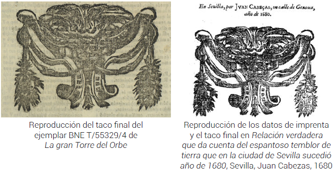 Nuestra primera hipótesis parte de que esta suelta de La gran Torre del Orbe salió de las prensas sevillanas en las tres últimas décadas del siglo XVII. Las descripciones y reproducciones de la colección de Samuel Pepys, ubicada actualmente en Magdalene College (Cambridge), hechas por Wilson y por Wilson y Cruickshank 19, nos han permitido identificar este taco con las mismas imperfecciones con el woodblock W2 20. Este perteneció a la gama de adornos que poseyeron Juan Cabezas, activo en Sevilla desde aproximadamente 1674 hasta 1681, y después Juan Vejarano, quien tuvo primero su taller en Cádiz y luego se trasladó a trabajar a Sevilla entre 1681-1683, posiblemente para el librero Lucas Martín de Hermosilla 21. Las impresiones de Juan Cabezas están íntimamente ligadas a las de Vejarano porque, una vez que el primero cesó su actividad, el segundo empleó una gran parte de sus tipos durante su época sevillana 22. Dentro de la colección, los estudiosos no recogen impresos teatrales sueltos salidos del taller del segundo impresor; en cambio, identifican como parte de los tórculos del primero los títulos 23: