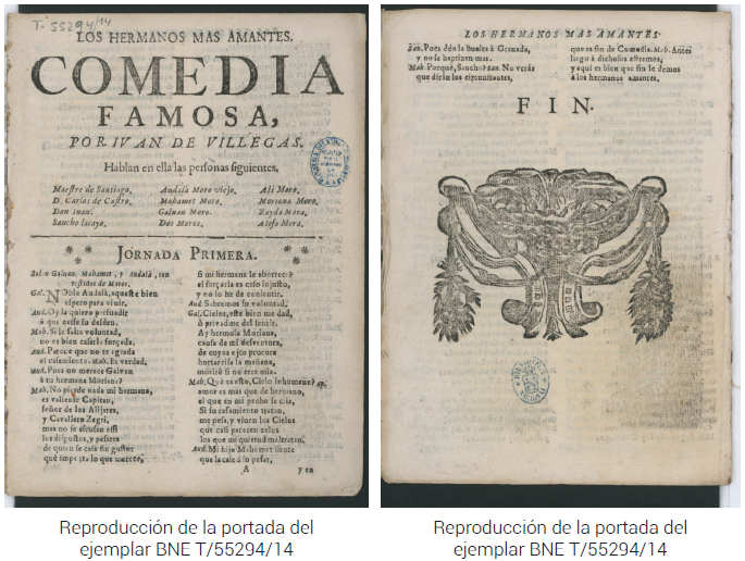 La tarea de localizar otras sueltas emparentadas con La gran Torre del Orbe, con la imprenta de Cabezas y con la colección de Samuel Pepys nos llevó a la comedia La morica garrida, obra de la que se tienen noticias entre 1623 y 1625, que se asocia a Juan Bautista de Villegas y que también recibe por nombre La morica garrida y hermanos más amantes32. Publicada en suelta con el título Los hermanos más amantes y atribuida a Juan de Villegas, conocemos dos ejemplares que se ubican, respectivamente, en la BNE (T/55294/14) y en la Österreichische National- bibliothek (*38.T.12.[Vol.2,10]). Su descripción analítica es la que sigue:
