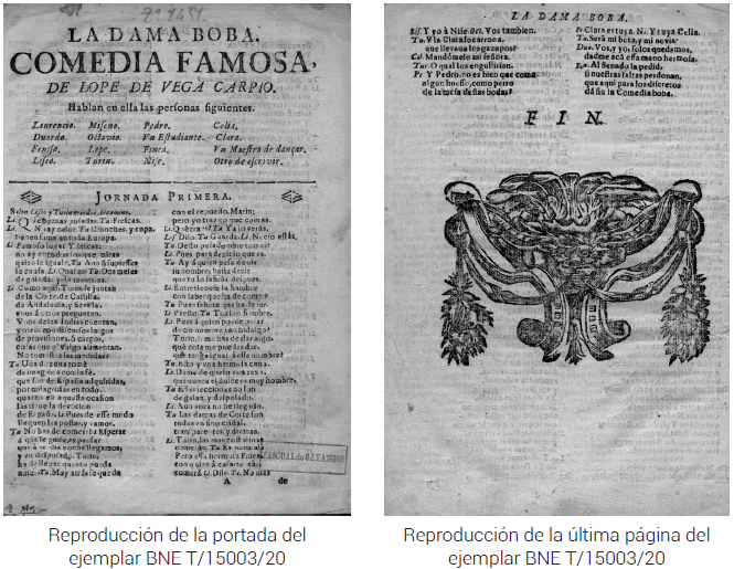 La última obra de la que nos ocuparemos ha gozado de gran reconocimiento, y a ella se le han dedicado numerosos estudios por haber sido considerada una de las piezas más sobresalientes de Lope de Vega: La dama boba. Esta comedia ha llegado hasta nuestros días en un autógrafo fechado el 28 de abril de 1613, en la Parte IX de comedias de Lope de Vega, en un manuscrito que copia esta parte, otro manuscrito y en dos ediciones sueltas ( S y T) 33. De estas dos últimas, nos interesa S, una temprana sin datos editoriales y que, de acuerdo con su más reciente editor, deriva de la Parte IX. Cuatro son los ejemplares de este impreso suelto que han sido localizados por la crítica: