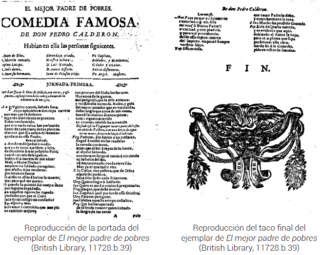 El examen tipográfico, además, nos ha permitido identificar el uso de R35 (encabezado, JORNADA PRIMERA), solo localizado en tres impresos atribuidos a Juan Cabezas en el tomo 1553 (núm. 1) y en el 1545 (núm. 24/8 y 34/35) de Samuel Pepys 35. Esta suelta emplea R8 (encabezado, COMEDIA FAMOSA), reconocido en la viuda de Rodríguez (1674), en Cabezas (1676-1680) y en Vejarano (1681-1682); las cursivas IT2 (autor), que también vimos para La gran Torre del Orbe, e IT6 ( dramatis personae). A pesar de las divergencias entre esta suelta y las anteriores, se percibe una combinación de rasgos tipográficos solo asociados, hasta la fecha y con los datos actuales, a las prensas sevillanas de Cabezas, como la convivencia de R35 y W2. No debe extrañar tampoco la diferencia en el diseño de las portadas, ya que también son muy acusadas entre el resto de las sueltas de este impresor, como se desprende de las alojadas en la colección de Samuel Pepys. La suelta de El mejor padre de pobres (núm. 22), de la que se conserva un ejemplar en la British Library con signatura 11728.b.39, permite observar un diseño diferente al de los impresos sueltos anteriores y más cercano al de La dama boba: