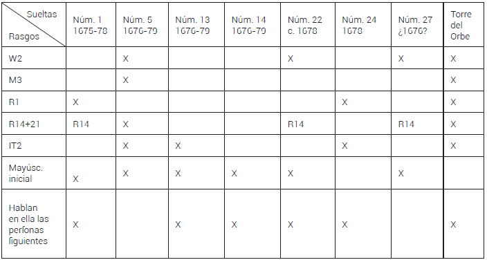 Sabemos que muchos de estos tipos fueron pasando de unos impresores a otros 30, de manera que conviene seleccionar aquellos rasgos significativos para tratar de proponer una atribución. Así pues, la particularidad de la combinación de R14 con R21, de la presencia de M3 y W2, y de la T dañada en la línea 1 (título) del mismo modo en que está en la suelta El premio en la tiranía (núm.1), lleva a inclinarnos a considerar que esta suelta pudo haber salido de la imprenta sevillana de Juan Cabezas. La comparativa de las características identificadas con su presencia en todos los impresos sueltos teatrales de la colección de Samuel Pepys vinculados a este impresor podrían sugerir que, además, fue dada a la estampa entre 1676-1679 31: