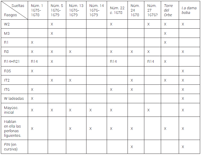 En relación con la tipografía, hemos sido capaces de identificar el uso de R1 (línea 2, encabezado, COMEDIA), vinculado a la viuda de Rodríguez (1671-1674), a Paredes (1675), a Cabezas (1675) y a Ramos (1675); el de la combinación de R14 con R21 (línea 10, encabezado de jornada), usado por la viuda de Rodríguez (1671- 1674) y Cabezas (1679-1681), y el de IT2 (línea 4, autor), reconocido en impresos sueltos de Blas (1672-1673), de Cabezas (1674-1680), de herederos de Blas (1678) y de Vejarano (1683) 29.
