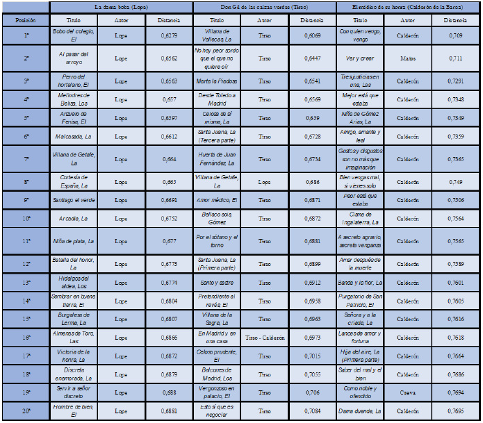 En primer lugar, entendemos que la obtención de las distancias estilométricas entre los textos supone un resultado de mucho interés para el investigador. Podemos medir la frecuencia de uso de las palabras en los textos y relacionarlos mediante diversos modelos matemáticos. Cuanto menor sea la distancia entre los textos mayor es su similitud léxica, lo que suele estar directamente relacionado con su autoría. En general, los resultados tienden a ser parecidos empleando diversos parámetros (número de palabras más frecuentes, distintos modelos, etc.) y nos conducen a la pista autoral 16. Por ejemplo, estas son las veinte obras con usos léxicos más cercanos a La dama boba (Lope de Vega), Don Gil de las calzas verdes (Tirso de Molina) y El médico de su honra (Calderón de la Barca) empleando el corpus completo de 2.800 textos.