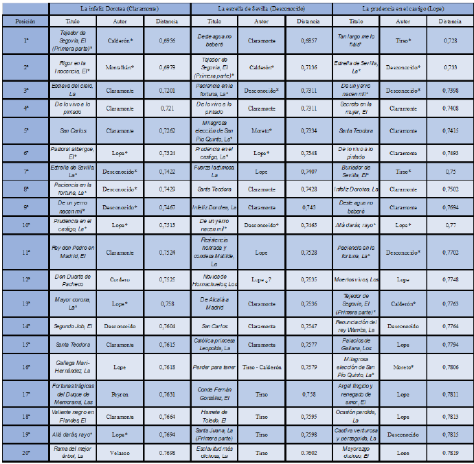 Por tanto, las casi 3000 obras del corpus han sido cotejadas, una por una, en busca de estas distancias y una posible relación con Andrés de Claramonte. Los resultados han sido muy satisfactorios desde un punto de vista general, puesto que una gran parte del repertorio canónico del dramaturgo ha respondido bien a las pruebas por distancias. Por otro lado, obras que se han puesto en relación con Claramonte en las últimas décadas también han aparecido de forma espontánea en los análisis, lo que apuntala estas atribuciones desde nuestra vía de estudio. Este extremo es el que más seguridad nos da de que nuestras pruebas pueden ser acertadas, puesto que, sin condicionar el experimento en absoluto, han aparecido relaciones con obras que la crítica había apuntado previamente y de las que en algunos casos no teníamos noticia alguna hasta después de las pruebas estilométricas. En último lugar, obras que nunca se habían atribuido a Claramonte también han mostrado una inesperada relación con este, lo que nos lleva a considerar seriamente el aumento de su corpus a la vista de los resultados. Sirvan como ejemplo estas tres obras: La infelice Dorotea, una de sus canónicas, La Estrella de Sevilla, que se le ha atribuido en varias ocasiones, y La prudencia en el castigo, nunca antes puesta en relación con nuestro dramaturgo. Los tres casos presentan una especial cercanía léxica con el repertorio clásico de Andrés de Claramonte. Estas relaciones se hacen mucho más patentes y lógicas si, además, tenemos en cuenta las atribuciones que se le hacen en este estudio, señaladas con un asterisco. Cada asterisco, pues, marca una obra que se ha relacionado de forma particular con su repertorio, tanto por estas pruebas como por las clasificatorias que explicamos enseguida.