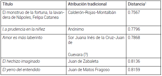 Con la voluntad de hacer uso del mayor número de herramientas posibles en nuestro trabajo, sometimos la comedia de El conde de Sex a un análisis estilométrico para comprobar la teoría más aceptada por la crítica en cuanto a su autoría. Para ello, recurrimos al proyecto ETSO, que cuenta con un corpus (CETSO 48) constituido por 2788 obras de 359 autores diferentes 49. Según indica el análisis recibido, las cinco obras con usos léxicos más próximos a nuestra comedia son los siguientes: