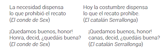 Tenemos constancia también de una suelta titulada Comedia famosa del conde de Sex, en la que se explicita la autoría de Antonio Coello. Al final de la comedia puede leerse: «Hallarase en la Imprenta de Francisco Sanz, en la Plazuela de la Calle de la Paz», aunque no se indica el año de publicación. Michaelis la data «en los últimos años del siglo XVII» 10. De esta misma imprenta parece surgir otro testimonio, la titulada Comedia famosa. El Conde de Sex. De Don Antonio Coello. Al final, se lee: «Hallarase en la imprenta de la calle de la Paz». Cotarelo indica que es de principios del siglo XVIII, sin entrar en más detalle 11.