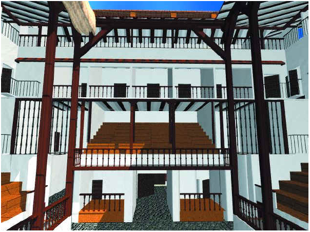En el caso del campo del estudio teatral barroco recientemente se ha observado que hay pocos ejemplos de trabajos que aprovechen las tecnologías de reconstrucción en 3D para recuperar estructuras teatrales 3. El primer antecedente relevante para la reconstrucción digital de espacios escénicos se encuentra en la reconstrucción del corral del Príncipe de Madrid realizada por Manuel Canseco 4. En ella, se teoriza sobre el espacio escénico del corral madrileño, pero se trata de una reproducción limitada por la tecnología de su momento, restringida en cuanto a detalles de los gráficos y la posibilidad de movimientos de la cámara. Si bien se puede acceder a vídeos que realizan un barrido del corral desde diferentes ángulos, no permiten al investigador trabajar con la reconstrucción en sí. En 2011 se consigue una recreación rigurosa del corral de la Montería en Sevilla, realizada por Piedad Bolaños Donoso, Mercedes de los Reyes y Juan Ruesga, que reconstruye con gran lujo de detalle el espacio escénico situado en el Alcázar de Sevilla 5 y recoge el proceso y resultados en un vídeo publicado en la plataforma YouTube 6, en un importante ejercicio divulgativo que multiplica la exposición y la accesibilidad entre el público general y el especializado. Cabe destacar el caso del corral de la Olivera de Valencia, una reconstrucción realizada bajo la dirección de Joan Oleza 7, que opta por la presentación en un vídeo que ofrece diferentes barridos para que el investigador aprecie una vista panorámica del corral desde diferentes ángulos, y además reconstruye la acústica del espacio, planteando un ejemplo de la sonoridad de unos versos recitados en él. En este caso, el equipo de Joan Oleza ha desarrollado, a través del programa Unity, una reconstrucción que puede recorrerse en primera persona, encuadrada en un mundo digital limitado que combina texturas fotorrealistas con la reconstrucción tridimensional digital 8. Estas reconstrucciones de espacios escénicos áureos proveen de una imagen realista, con rigor arqueológico y arquitectónico, y resultan enormemente útiles para visualizar la estructura de los espacios escénicos y ofrecer una mayor comprensión sobre su funcionamiento y posición en la ciudad.