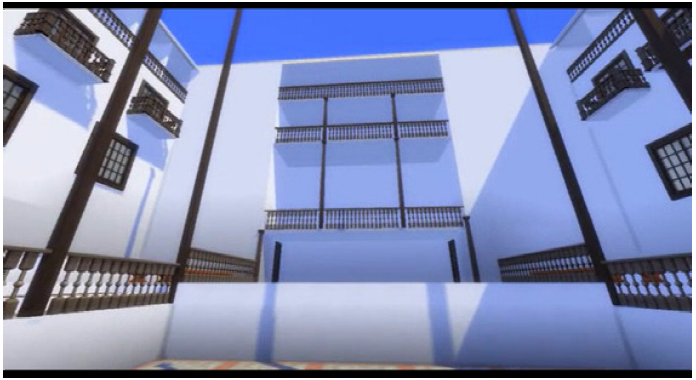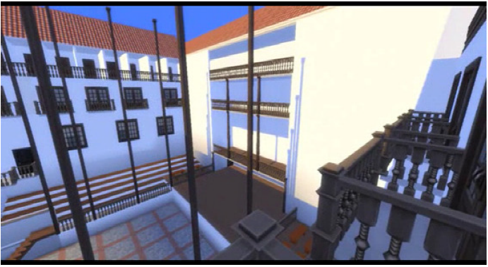 El camino que se plantea, pues, es el uso de tecnologías actuales para refrescar el ejemplar trabajo que se ha hecho hasta ahora con la reconstrucción en tres dimensiones de espacios teatrales siglodoristas, pero en combinación con la capacidad de trabajar en ellas para la mejor visualización y planteamiento del movimiento escénico de una obra, además de su visualización en primera persona, hasta alcanzar un cierto nivel de interactividad para mejorar la experiencia. Una línea de investigación que muestra potencial y que permitiría ambas funciones —interactividad y visualización en tres dimensiones— yace en el uso de los videojuegos, diseñados con cada vez mayor calidad gráfica y orientados a una experiencia inmersiva 13. La reconstrucción del corral del Príncipe de Madrid ya ha sido planteada a través de una herramienta de creación en el contexto de los videojuegos; se aloja en You-Tube una visita por el interior del teatro realizada gracias al videojuego Minecraft, creada en 2011 por Cristian Rodríguez Santandreu con la colaboración de Judith Rodríguez para su uso didáctico, como parte de las clases del profesor Santiago Martínez Hernández en la Universidad Complutense 14. De nuevo encontramos obstáculos, pues el sistema de construcción de Minecraft inevitablemente obliga al creador a jugar bajo sus reglas, con un concepto de diseño centrado solo en formas cúbicas. Es cierto, empero, que ya se busca un elemento interactivo mayor y nos encontramos con el concepto de trabajar con la reconstrucción a nivel usuario desde cero.