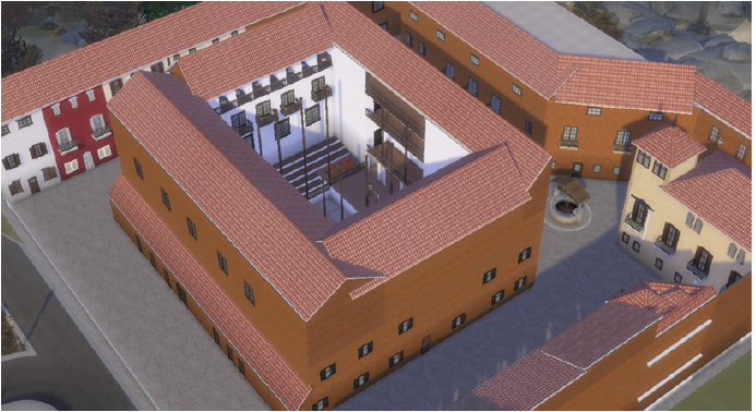 Igualmente, se ha consultado la documentación relativa al corral del Príncipe recopilada por Shergold y Varey 16 para obtener una mejor conciencia de los espacios trabajados y su posible navegación, así como un análisis arquitectónico general del corral 17. No obstante, debido al formato de reconstrucción en tres dimensiones, la fuente principal para la recreación en Los Sims 4 ha sido el modelo realizado por Canseco ( imágenes 6 y 7). El formato permitía una visualización más cercana al resultado que se podía desarrollar en la herramienta de construcción del videojuego, y se ha utilizado como modelo para la coordinación de las tres plantas del edificio y la estética general del corral ( imagen 8).