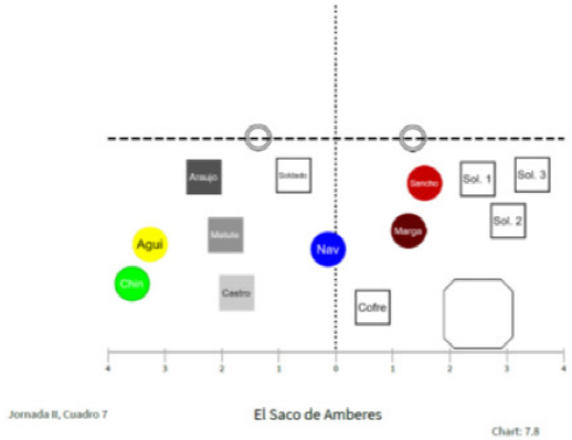 Lo más parecido a una herramienta digital específica para esbozar movimiento escénico se puede encontrar en un proyecto llamado Stage Block, una herramienta básica que permitiría mostrar entradas y salidas de personajes enlazadas con el guion 9. Aunque esta idea contiene un gran potencial, no fue desarrollada más allá de una mera y esquemática presentación en 2019, y no cuenta con la reconstrucción en tres dimensiones del espacio escénico. Por otra parte, existe Stage Write, una herramienta digital que ha sido utilizada para al menos ochenta producciones de Broadway 10. Aunque funciona bajo suscripción, ofrece la posibilidad de crear un gráfico a vista de pájaro del escenario. Así, y creando iconos para cada personaje, se puede dividir la escena en cuadros e incluso dividir estos en diferentes diapositivas para representar el movimiento del personaje ( imagen 1). Si bien el sistema de recrear el movimiento diapositiva por diapositiva resulta algo tedioso, el resultado es un documento PDF que se puede hojear para obtener un resultado stop-motion del movimiento a vista de pájaro. Esto ofrece al investigador una idea general de cómo se estructuraría el movimiento escénico de la obra y cómo de factible resulta seguir acotaciones, así como una mejor visualización de la cantidad de personajes en escena (y la cantidad de actores que podrían representarlos de manera efectiva).