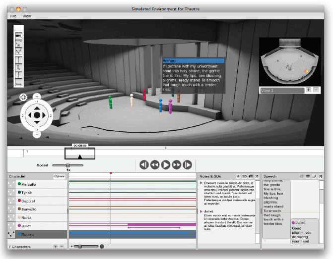 Esto no deja de ser, sin embargo, una reconstrucción en dos dimensiones y sigue teniendo numerosas limitaciones. No está pensada para visualizar un corral de comedias y, aunque plantea un interesante enfoque a la reconstrucción de movimiento escénico, no es combinable con el concepto de la reconstrucción en tres dimensiones que plantean las maquetas digitales ya creadas. La fusión de una reconstrucción dinámica en tres dimensiones de un espacio escénico del Siglo de Oro y una herramienta que permitiera visualizar en dicho espacio el movimiento de representantes ha sido casi lograda por la herramienta SET ( Simulated Environment for Theatre), la cual, muy cercana a Stage Write, se propone representar el movimiento escénico de los personajes en una interfaz ( imagen 2) que permite también el seguimiento del texto teatral, en una visualización en tres dimensiones 11. No obstante, no contempla aún la recreación arquitectónica de un espacio dramático concreto, y el enlace al software producido en este proyecto está inactivo 12.