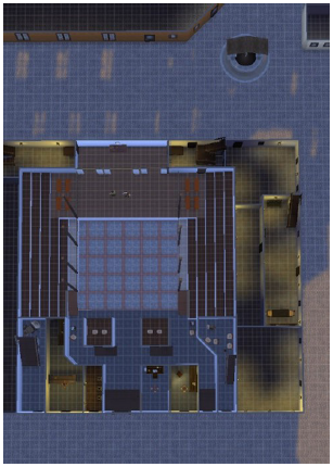 El elemento interactivo es proporcionado por el hecho de que la reconstrucción se aloje en un videojuego que, si bien no permite la inmersión absoluta, pues mayoritariamente la cámara se sitúa sobrevolando el espacio en el que se juegue, sí nos permite que el personaje —o Sim— que diseñemos pueda moverse a nuestra orden por la reconstrucción. Es entonces cuando podemos activar la opción de vista en primera persona y proporcionar así una visualización más inmersiva del corral de comedias. Se ha podido crear, pues, una recreación lo más fiel posible a las representaciones ofrecidas en Ruano de la Haza y la poca documentación que se conserva en relación con el corral del Príncipe. Se ha contado como fuente básica para el planteamiento inicial de la planta el plano del corral del Príncipe dibujado por Pedro de Ribera en 1735 ( imagen 3), que John Allen también utilizó en su reconstrucción. No obstante, las limitaciones de la herramienta de construcción de Los Sims 4 no han permitido que el plano final coincida con exactitud con el original, si bien ha resultado fundamental en el asentamiento inicial de la reconstrucción ( imagen 4), particularmente en la reconstrucción de las entradas, pasillos de salida y escaleras. El trabajo de Allen también ha resultado fundamental en la visualización y teoría del interior del corral del Príncipe y la configuración de los diferentes aposentos que dan al corral con vista sobre el tablado 15.