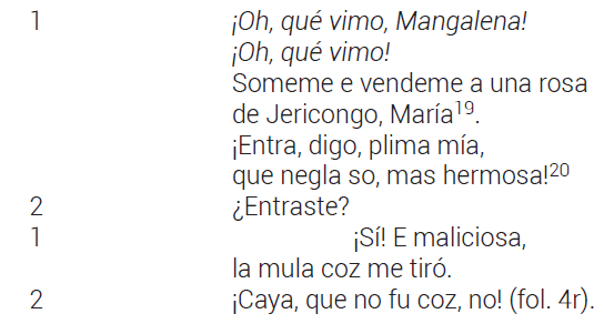 Veamos una muestra de su habla. En este villancico, como suele ser habitual en textos de esta clase, los negros intentan organizarse para ir a Belén a adorar a la Virgen y el Niño, hecho que usualmente sucede después de que se les avise del nacimiento. Aquí es alguien de su raza quien llega con prisas para comunicar la noticia a los demás, y pronto procuran ponerse todos en camino. También es habitual que recurran al empleo de onomatopeyas o palabras con una sonoridad muy marcada 18, que mencionen a los animales del portal y que intenten dignificarse igualándose o mostrándose superiores a los blancos: