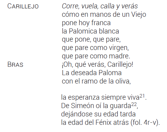 Como se observa, pues, estos villancicos, coplas o letrillas cifran en sí algunos de los principales rasgos de las canciones navideñas propias de la época. Dado que se trata de la reutilización de unas letrillas de Góngora, resulta difícil acertar con una denominación exacta del género. Teniendo en cuenta las alturas del siglo xvii en que nos encontramos, estas canciones podrían recordar por su función a las coplas para cantar —de tanto éxito por aquel entonces—, que servían para amenizar celebraciones privadas. El hecho de que, presumiblemente, se interpretasen después de la representación del Coloquio, puede recordar también a las obras de asunto navideño del teatro de finales del siglo xv y comienzos del xvi. En ellas, era frecuente culminar la representación dramática con algunos cánticos, como pudo haber sucedido aquí. Se trata de géneros con fronteras algo difusas pero con un denominador común: la celebración, en la mayoría de los casos, del nacimiento del Mesías, uno de los sucesos más importantes para el creyente y, en la cosmovisión de la época, una de las celebraciones más populares del año.