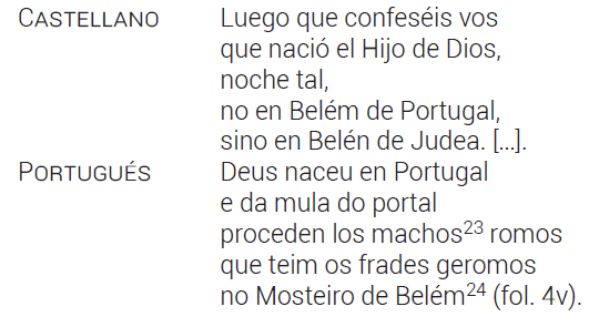 El pliego acaba con una letrilla en castellano y portugués, que así se anuncia. Se trata, como los anteriores, de un villancico dialógico, esta vez protagonizado por un castellano y un portugués. No es muy común que aparezcan las dos nacionalidades en el mismo villancico, aunque sí es habitual que los portugueses hablen de Castilla y los castellanos. Como todos los personajes regionales, los portugueses tratan de atribuirse el origen del Niño, algo a lo que aquí el castellano niega, adelantándose a lo que pudiera decir su compañero. Normalmente, se juega en estos villancicos, además, con la homofonía entre Belén y Belém, la villa lisboeta, lo que les permite reforzar la idea de que Cristo es portugués: