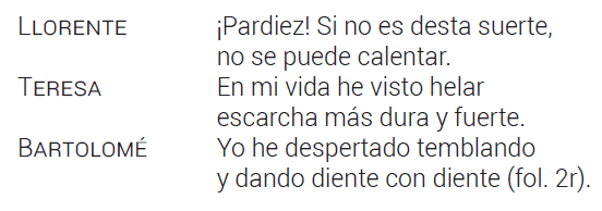 El frío se relaciona con las situaciones maravillosas que anuncian el nacimiento de Cristo. En este tipo de piezas es muy habitual que se aluda al frío y la nieve especialmente intensos de esa noche, como hace Teresa: «En mi vida he visto helar / escarcha más dura y fuerte» (fol. 2r). Además del frío, los personajes suelen comentar que notan el ambiente enrarecido, algo que también parecen percibir los animales, como comentan los pastores de la Égloga o farsa del nacimiento de Nuestro Señor Jesucristo, de Lucas Fernández: «Mis pastores y mis cabritos / asmo que tienen espritos» 8.