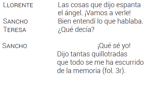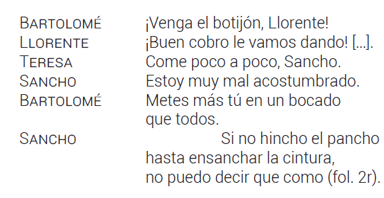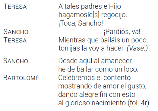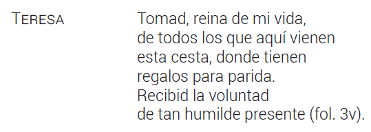 Comenta Teresa en su última intervención que va a preparar unas torrijas. Subyace aquí, por último, otro de los tópicos asociados a los pastores: la entrega de presentes. Usualmente, estas escenas van acompañadas de un reconocimiento por parte de los pastores de su condición rústica y de lo humilde de sus regalos: