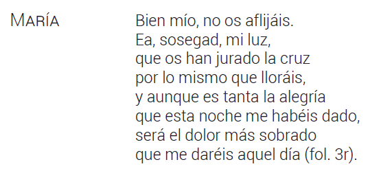 Otra de las escenas representadas con mayor asiduidad en el teatro navideño es el anuncio del ángel a los pastores, que tiene como referencia el Evangelio de san Lucas(2, 8-14). Aquí, el monólogo del ángel recoge muchas de las metáforas e ideas asociadas a Cristo: la encarnación como disfraz, el sol helado, el hielo que arde, el león y el cordero, el sacrificio por la humanidad… (fol. 2v). El Coloquiotambién contiene un monólogo de María. Mientras José duerme, antes de la llegada de los pastores, la Virgen habla con el Niño y expresa el amor que siente por él. Por sus palabras, parece que el recién nacido está inquieto y trata de calmarlo, planteamiento bastante habitual en las canciones que se le cantan al Niño. Tampoco faltan alusiones a la muerte de Cristo, premonición que aparece con frecuencia en la literatura navideña. Estas son algunas de las palabras que le dice María al bebé que sostiene en brazos: