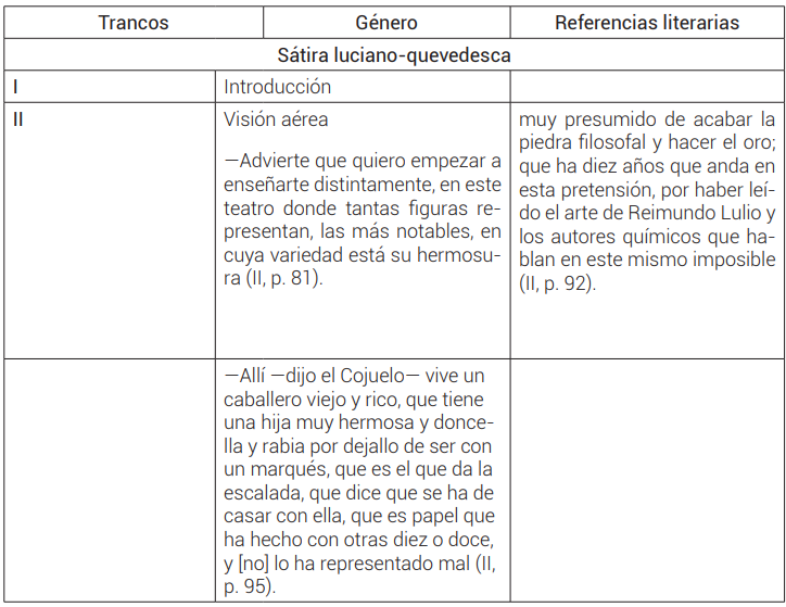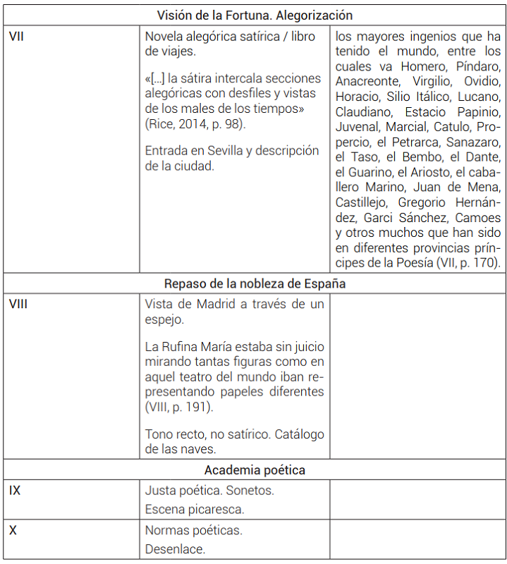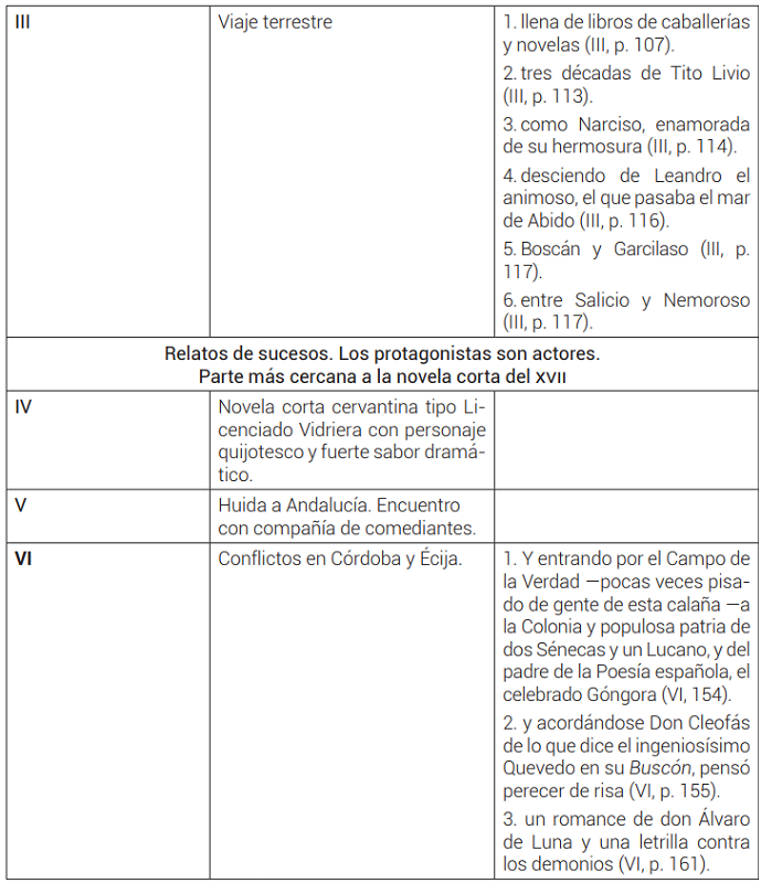 El ambiente metaliterario de la novela nos confirma en su carácter libresco. Para concluir insertamos un cuadro en que podemos dibujar una sátira lucianesca-quevedesca, que abarca los tres primeros Trancos. Una segunda parte, que incluye los tres siguientes Trancos (IV, V y VI), que calificamos como «Relatos de sucesos», en los que los protagonistas son actores y nos parece la parte más cercana a la novela corta del XVII; y una tercera parte que tildamos de alegórica, pues incluye una visión de la Fortuna (Tranco VII). A nuestro juicio, el Tranco VIII, con su valoración de la nobleza de España es una suerte de catálogo de las naves homérico, carente de ironía; y finalmente los dos últimos trancos (el IX y el X) están conformados como Academia poética. Hibridismo temático, hibridismo estructural, hibridismo completo en esta obra maestra del XVII.