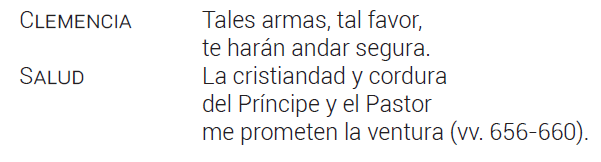 Esto se refleja en la caracterización contrastada de sus vestimentas y en la actuación inversa de los personajes. Pestilencia aparece desde la primera escena caracterizada física y moralmente 24 de forma desagradable y montada sobre un basilisco, jactándose de haber vencido a la Nueva España. Llama al Furor, que sale a escena con la cabeza del Contento en una mano, y, posiblemente, con una espada en la otra 25, y le ordena que siga expandiendo su «mortífero veneno» en los pueblos aún indemnes, llevando calenturas, ciciones «y cien mil modos de males» con sus huestes, y poniéndolos en tal estrecho, «que no les valga el Saber / ni los remedios que han hecho» (vv. 169-170). Reaparece en la escena sexta para escuchar plácidamente en boca de Furor las hazañas de sus «fuertes guerreros», para preguntarle por el medio que utilizarán para entrar en «la tierra caliente», que hasta ese momento se encontraba a salvo de sus ataques, y para declarar la guerra a sus habitantes «a sangre y fuego», dejando en las zonas frías de la Nueva España a Pesar y Desasosiego encargados de su «imperio». A sus actuaciones, cargadas de soberbia y de jactancia, moderadas prudentemente ante la presencia de Clemencia y de Placer 26, se opone Salud, cuya actitud oscila desde un estado inicial de aflicción e impotencia por sentirse incapaz de socorrer a quienes mueren a manos de Pestilencia y sus secuaces (escena tercera) a una posición arrogante, cuando re- vestida con las armas forjadas por Devoción, Esperanza, Caridad y Oración desafía a Pestilencia y la vence finalmente 27 (escena séptima):