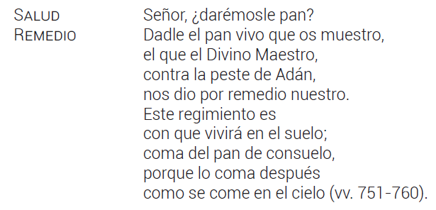 Antes de salir de escena Remedio Celestial se despide de Clemencia anunciándole que la volverá a visitar «con otras consolaciones»; lo que cumplirá al final de la séptima escena, cuando aparece solícito a los ruegos de Salud y de Clemencia con la medicina que sanará corporal y espiritualmente a los enfermos (a la vez los indios y el Hombre) siempre que estos la reciban con voluntad, penitencia y dolor. La urdimbre de «esta preciosa trïaca / que los dolores aplaca, / y del ánima perdida/ toda la ponzoña saca» (vv. 717-720), mezcla de dieta y de oración, se presenta al fin como el sacramento indispensable que Remedio Celestial muestra al ser humano para que supere de forma concluyente enfermedades y pecados y pueda disfrutar definitivamente del pan del cielo: