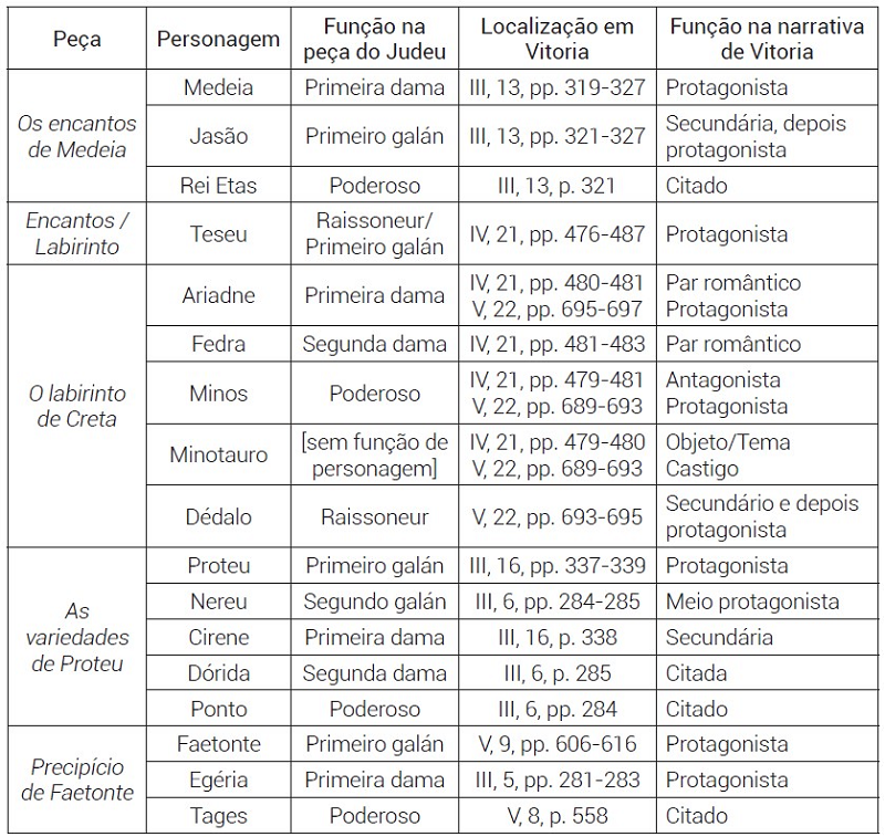 Na tabela abaixo, que sintetiza a discussão, há a divisão entre as personagens protagonistas e secundárias dos enredos amorosos de António José da Silva, bem como a indicação se figuram como protagonistas ou secundárias das narrativas de Vitoria: